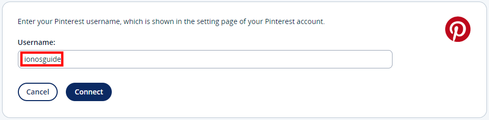 Now navigate back to your IONOS account and insert your Pinterest username into the setup assistant where it says ‘Username’. Finally, click Connect to connect your Pinterest with your domain.