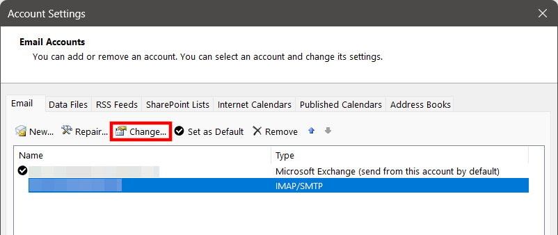 In the Mail Setup window, select the option ‘Email Accounts’. Outlook will then display a list of all email accounts linked to your Microsoft client. Click on the account for which you want to change the password, and then click ‘Change…’.