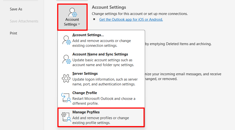 If you’ve changed the password for your email account (e.g., Hotmail, Gmail, etc.) and want this change to take effect in your Outlook client, you’ll need to update your account settings in Outlook. To do this, start by opening the ‘File’ tab. Then, under Account Information, click on ‘Account Settings’. In the pop-up menu, select ‘Manage Profiles’: