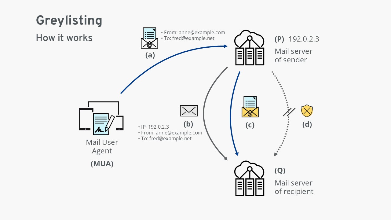 (b) The sender’s mail server (P) forwards the email to the recipient’s mail server (Q). At this stage, server Q checks the email’s envelope data: the IP address of the sending server and the associated email addresses. If this combination is unfamiliar, server Q temporarily rejects the email with a technical error and records the envelope data in a table. The message is now ‘greylisted’.