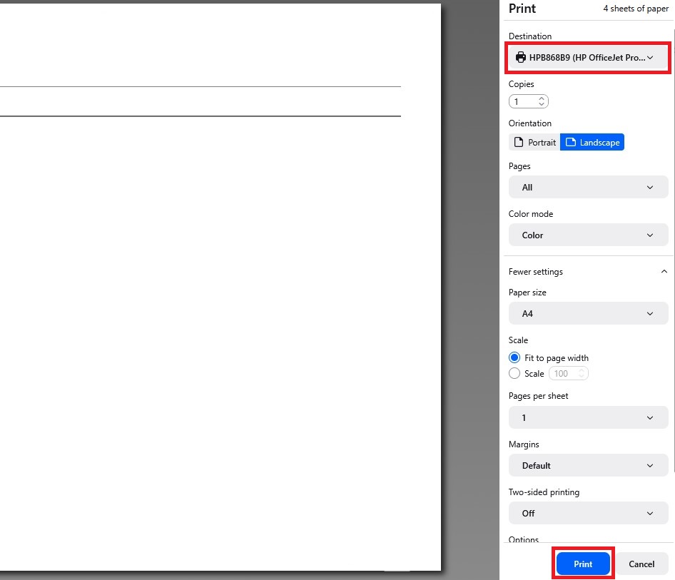 Step 3: You can use the selection fields to configure the printing settings. Click on the rectangular Print box to start the printing process.