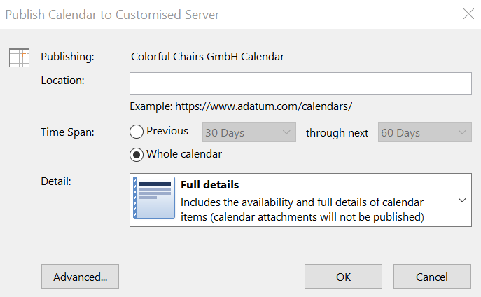 - If you decide to publish to a WebDav server, Outlook will prompt you for the WebDav server address, and the desired time span and level of detail using the Publish Calendar to Customised Server box.