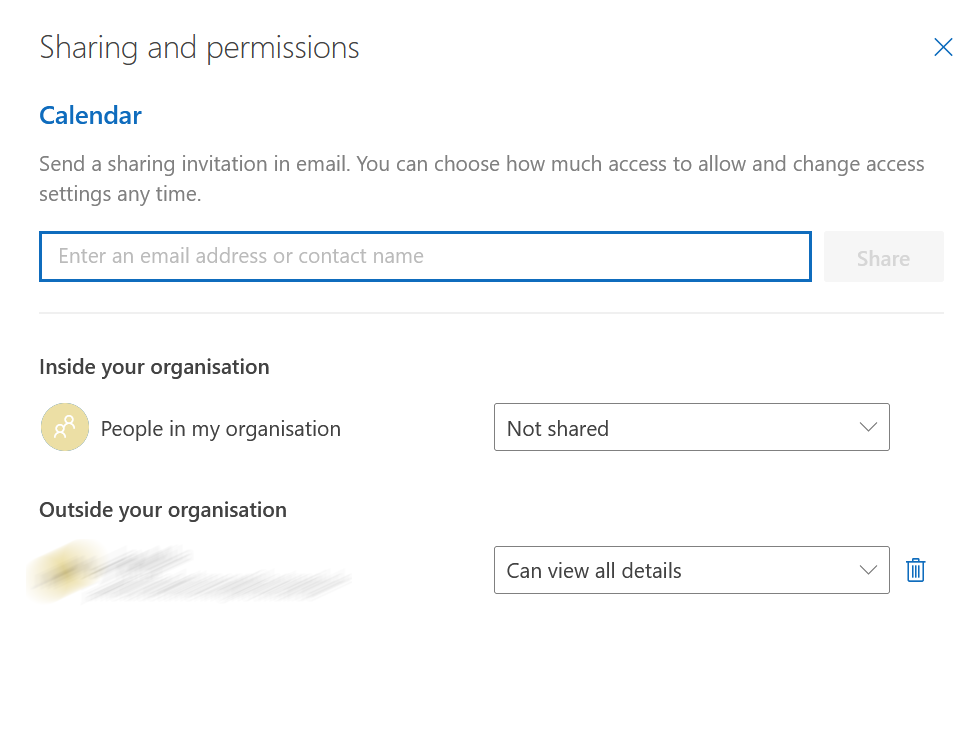 In the Sharing and permissions dialog box that appears, you can view who has access to your calendar both within and outside your organisation. You can also modify the Outlook calendar permission settings directly from there.