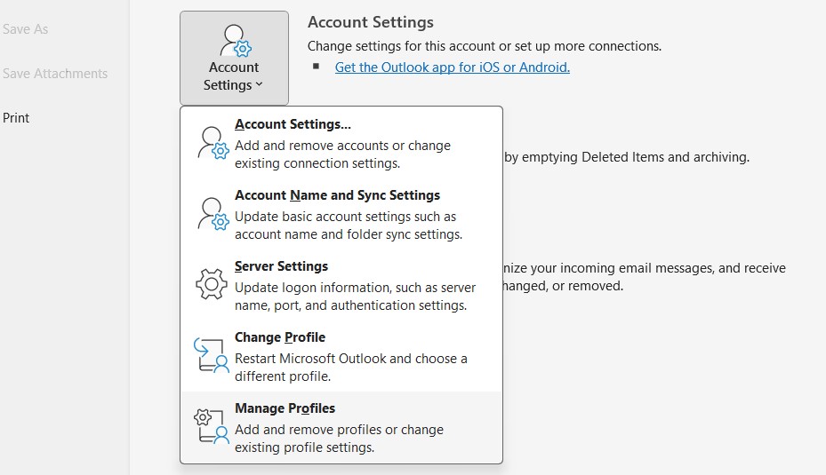 To set up or change the SMTP server in Outlook, first open Microsoft’s email client and then click the ‘File’ tab. Next, select ‘Account Settings’ and then ‘Manage Profiles’.