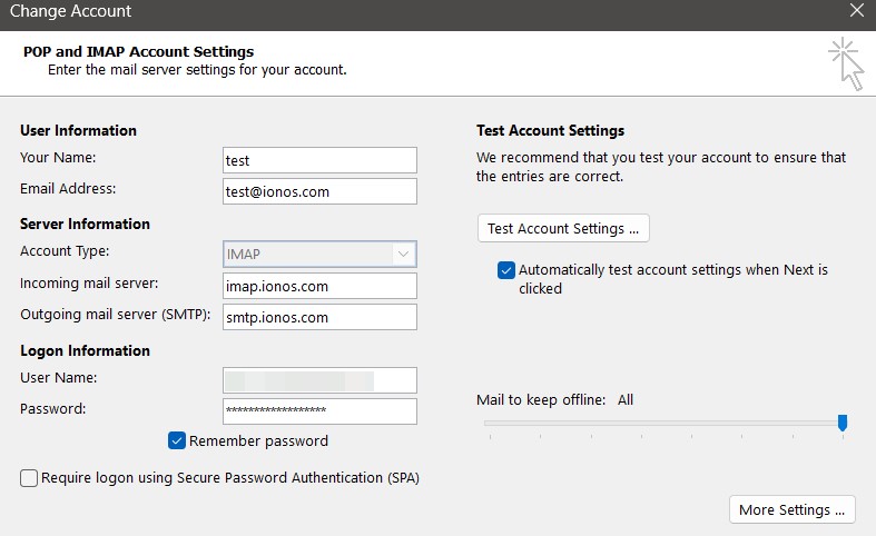Under ‘Outgoing mail server’, you can now enter the SMTP server of your choice, such as the IONOS SMTP server smtp.ionos.com.