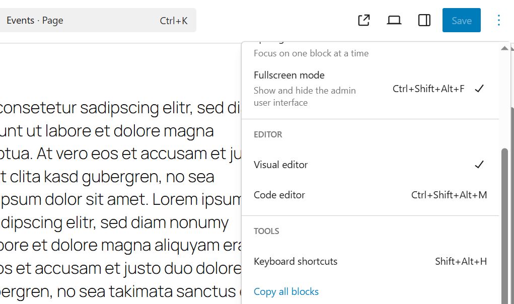 In the WordPress backend, open the page or post you want to copy. To do this, click on ‘Pages’ and then ‘All Pages’ in the left sidebar. For the page you want to copy, click ‘Edit’ to open it in the Gutenberg editor. Once there, click the three stacked dots in the top-right corner. In the menu that appears, select ‘Copy all blocks’.