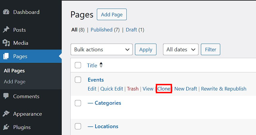 Now it’s time for the key step: using Yoast Duplicate Post to duplicate WordPress pages or posts. In the WordPress backend, go to the left sidebar and choose either ‘Pages’ or ‘Posts’, then select ‘All Pages’ or ‘All Posts’. You’ll see a list of all your WordPress content. Hover over the page or post you want to duplicate, and several options will appear — including ‘Clone’. Click it to create a copy.