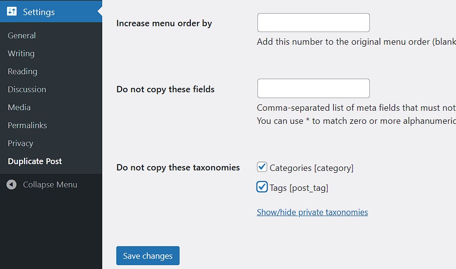 After installing and activating Yoast Duplicate Post, go to ‘Settings’ in your WordPress backend and click the ‘Duplicate Post’ button that appears after installation. There, you can adjust which elements of a page or post should or shouldn’t be copied. If you’re unsure which options to select, it’s best to keep the default settings and test by duplicating a page or post.