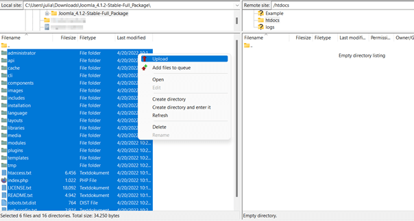 Extract the ZIP file and upload the Joomla package files to the root directory of your web server (usually ‘public_html’ or ‘htdocs’) using an FTP-Client. We use the open source client FileZilla.