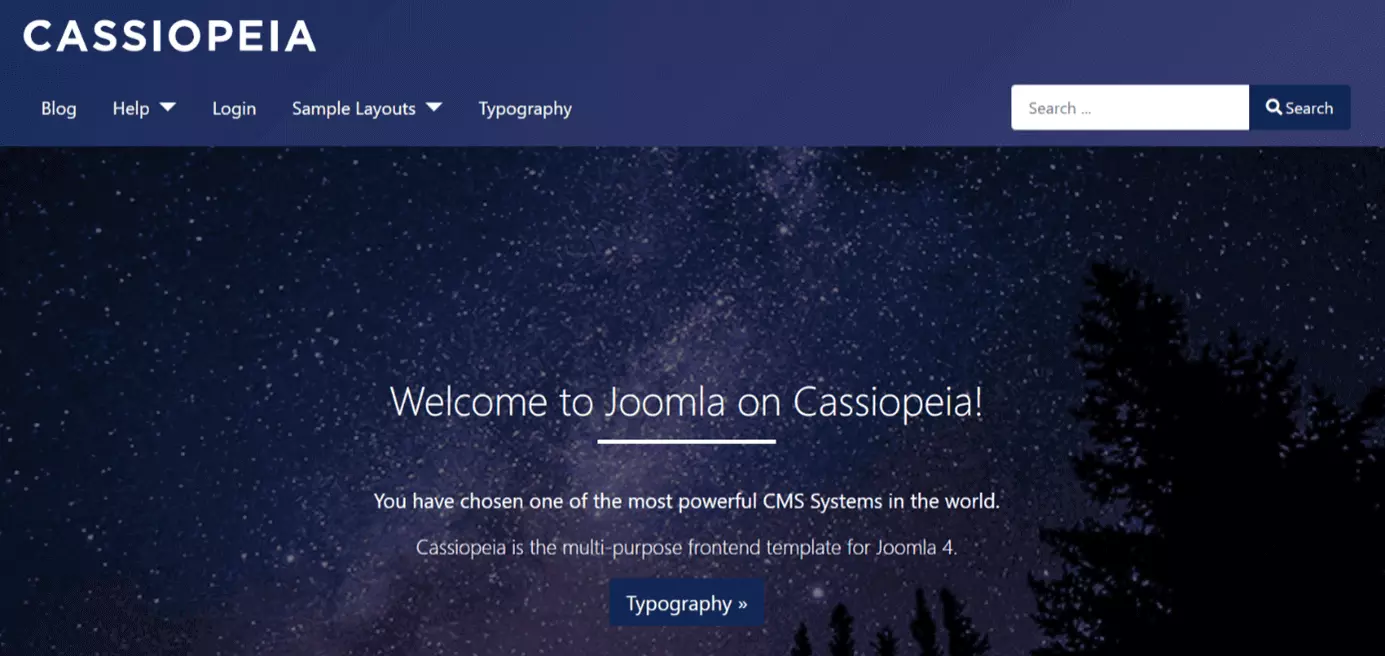 When you log in to the admin area after the installation is finished, you can complete the first admin tasks in the backend and get your Joomla project rolling. A good first step for everyone that wants to get to know Joomla better is to install the blog sample data. You’ll find it on the dashboard under ‘Sample Data’. Joomla will then create a small demo blog with placeholder content using the standard template Cassiopeia.