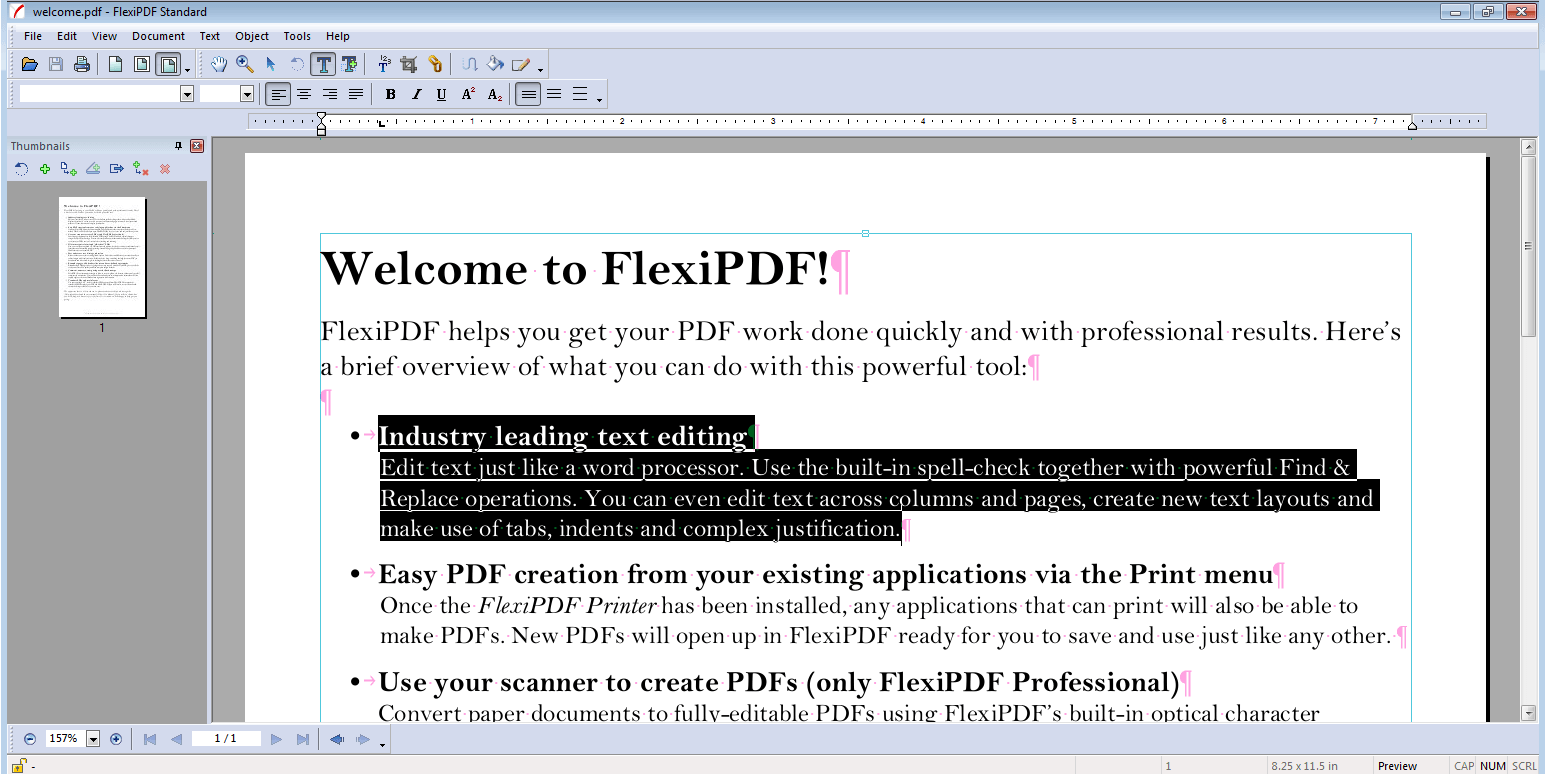 In FlexiPDF’s trial version you can change the body of the text, i.e. to make edits within the text. This is a major advantage if you want to retrospectively change the text in a PDF. Many other (mostly free) PDF editors often just allow you to remove or move paragraphs, but not to edit within the text itself.