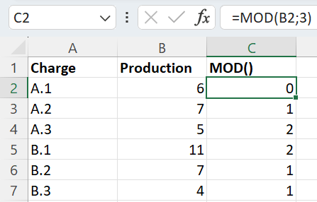 In the spreadsheet below, the first column contains the number to be divided. The second column contains the divisor, which you want to divide the number by. This results in the following formula: MOD(Number;Divisor).