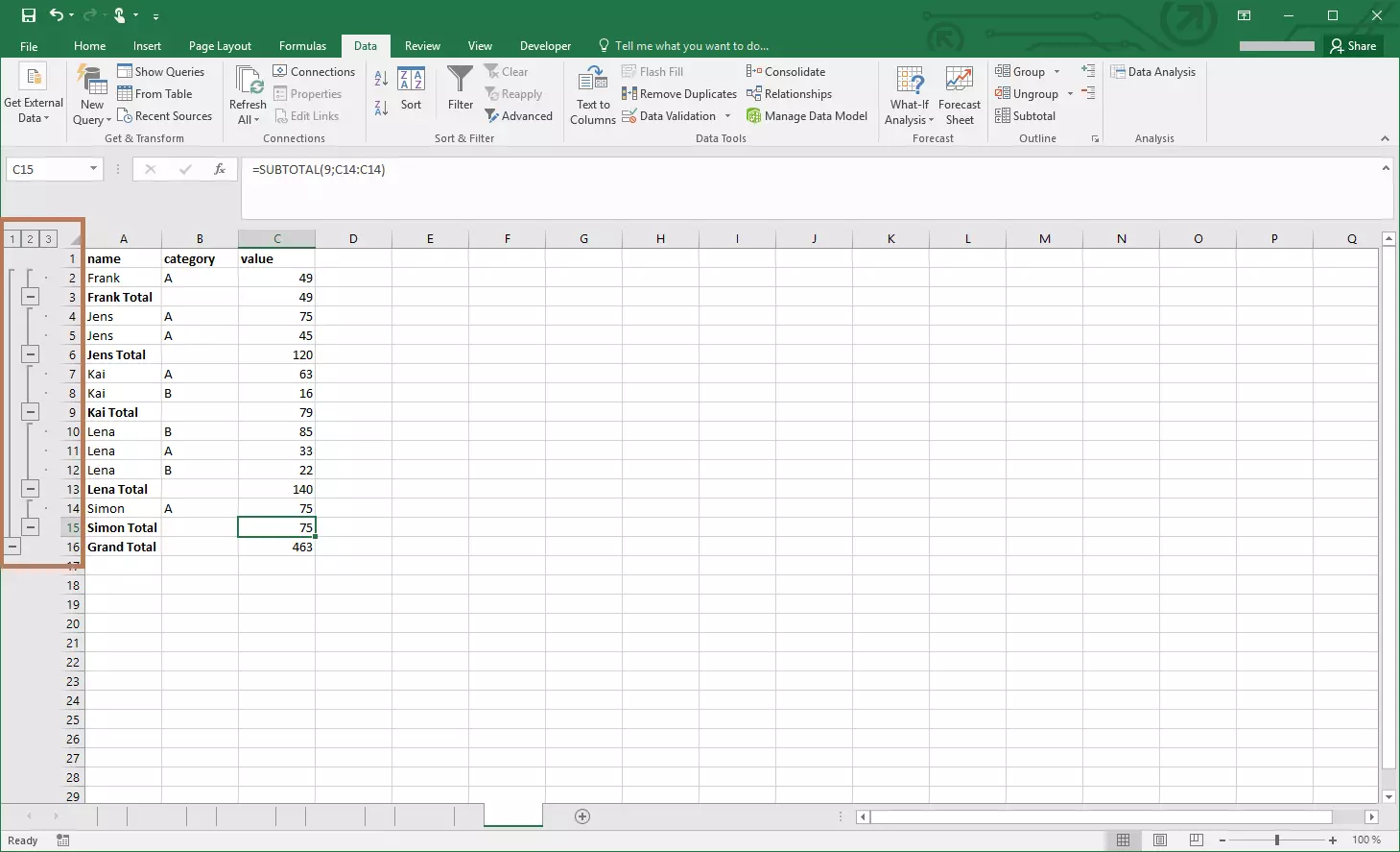 Besides the function, which is easy to integrate in formulas, Excel offers another tool of the same name. You can find it in the “Data” tab under the “Subtotal” button. This tool is useful if you have a multi-column list in Excel, for example. You can include a fixed set of values (generally non-numerical) – for example names – in one column. In turn, these entries are assigned to numerical values: revenues, point scores, measurements and similar data. The tool helps you calculate subtotals from groups – all identical entries in one column are grouped and the corresponding values in the other column are calculated.