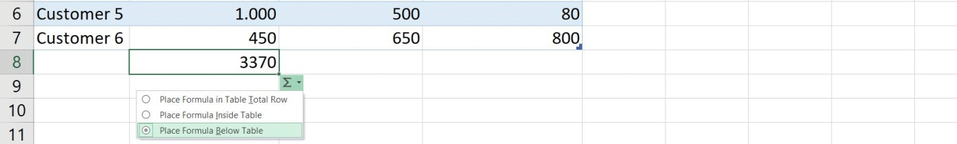 =SUM(B2:B7)With a formatted table, the result, which you can get after confirming the formula using the Enter key, can optionally be incorporated as part of the table result row, as an ordinary table row or in an independent row under the table – without its own formatting. Click on the already covered AutoCorrect function and select the desired option: