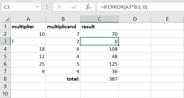 =IFERROR(A3*B3; "false value")If you want to leave the cell blank in the event of an error, enter consecutive double quotation marks.