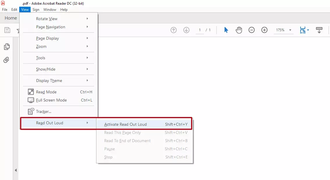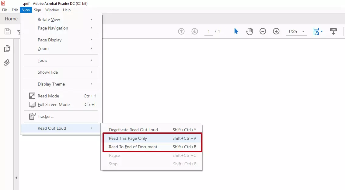 While you have the PDF read aloud, you can pause the voice output or stop the reading altogether. These functions are active as soon as speech output begins. You can also use key combinations [Shift] + [Ctrl] + [E] or [Shift] + [Ctrl] + [C] to pause and stop. Else you need to navigate via the View menu while reading is in process and thus may not be able to stop at the precise position.