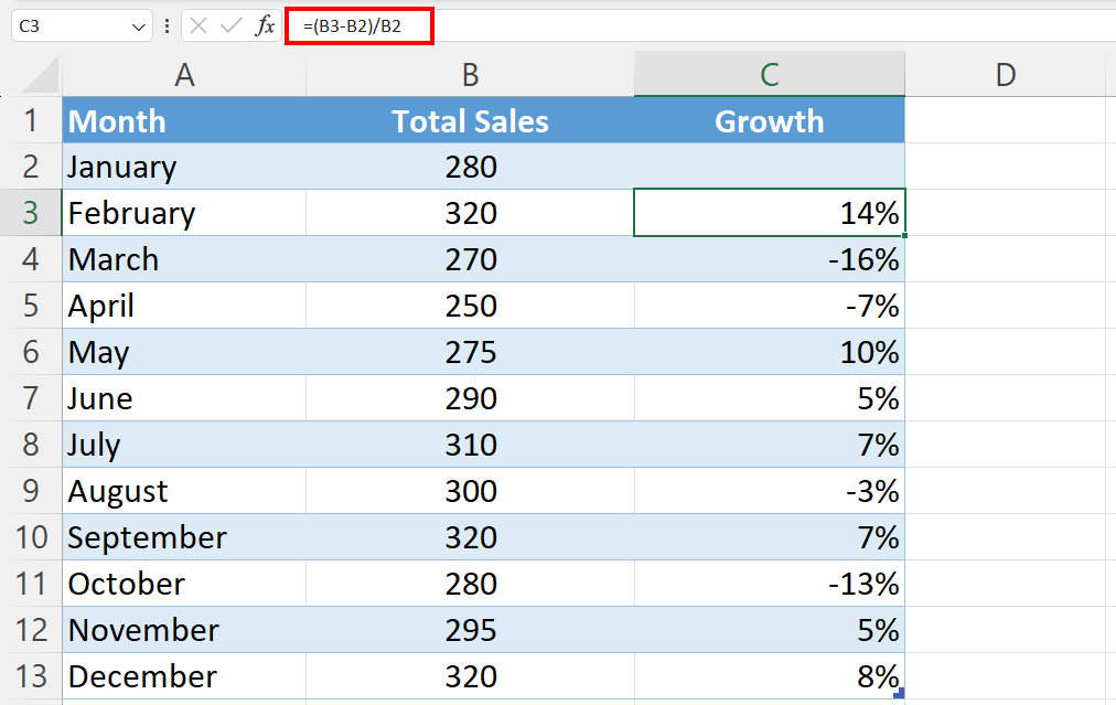 In the example below, we’ve entered all monthly sales in column B and calculated the growth in column C. Start with the sales from January in cell B2 and determine the percentage growth for February in cell C3. To do this, enter the following formula in cell C3: