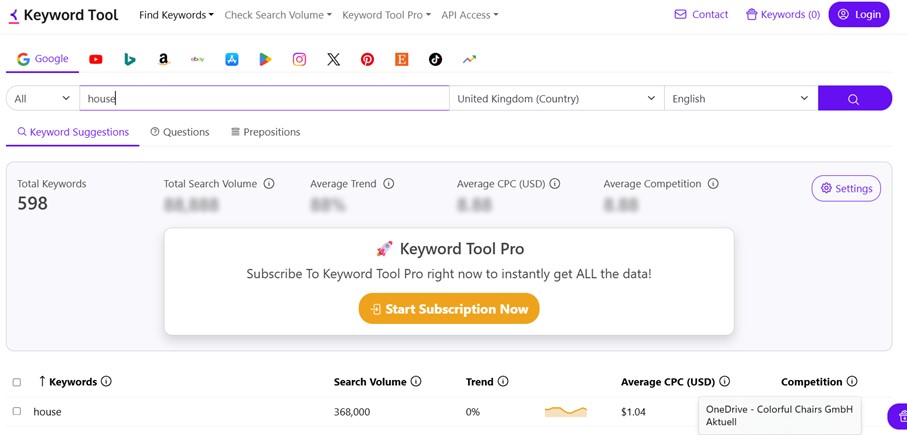 When it comes to the search volume of the respective keywords, the Keyword Planner alternative behaves similarly to the Google model in that you only receive the exact number of monthly searches if you opt for the paid packages, which are ‘Pro Business’, ‘Pro Plus’, or ‘Pro Basic’. Otherwise, Keyword Tool does not show any search volume. If you use one of the paid subscriptions, you receive twice as many keyword results. The ‘Pro Plus’ and ‘Pro Business’ packages additionally display competition and cost per click, based on the values from Google Ads.