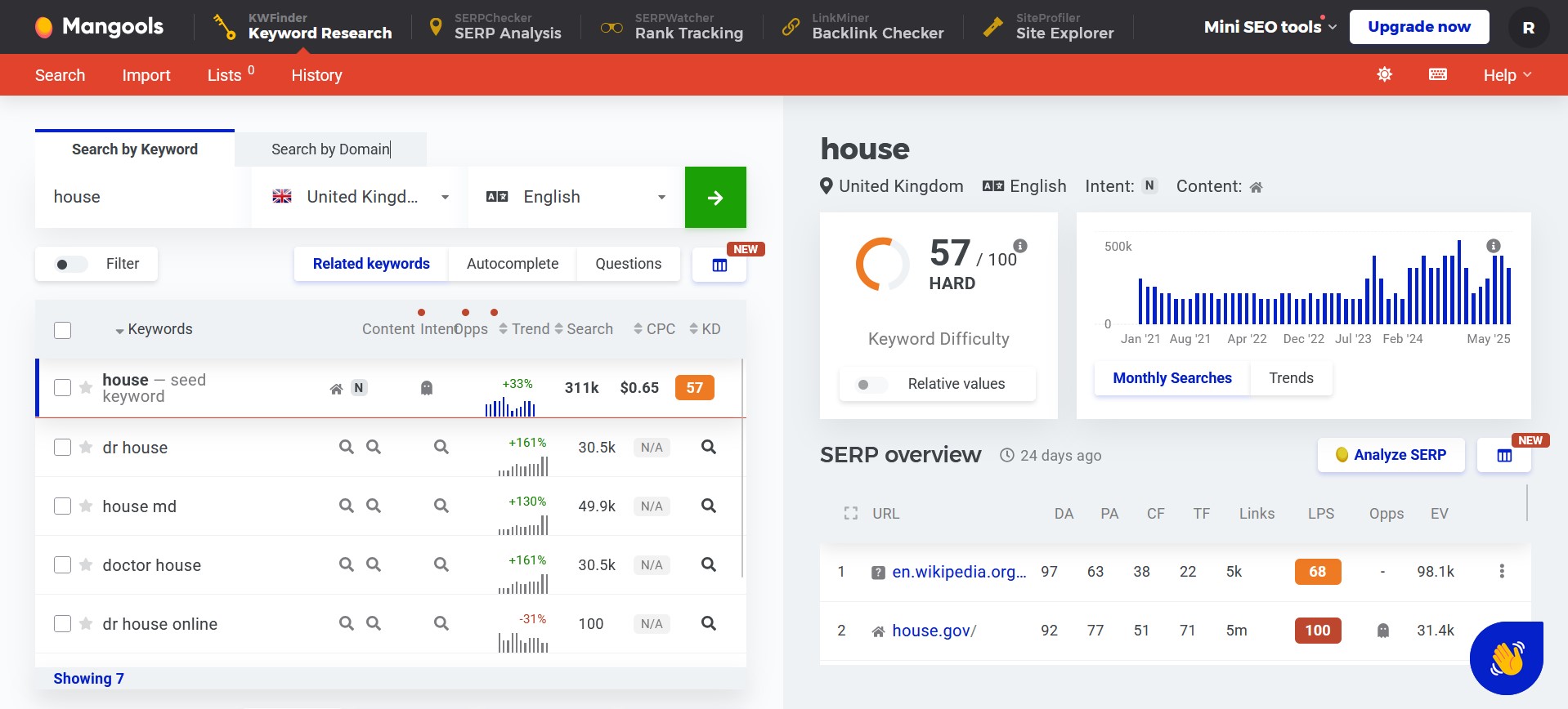 - Related Keywords: This standard function allows the research tool to search for similar and topic-related search terms and combinations. It is based on the mangools database and a proprietary algorithm.