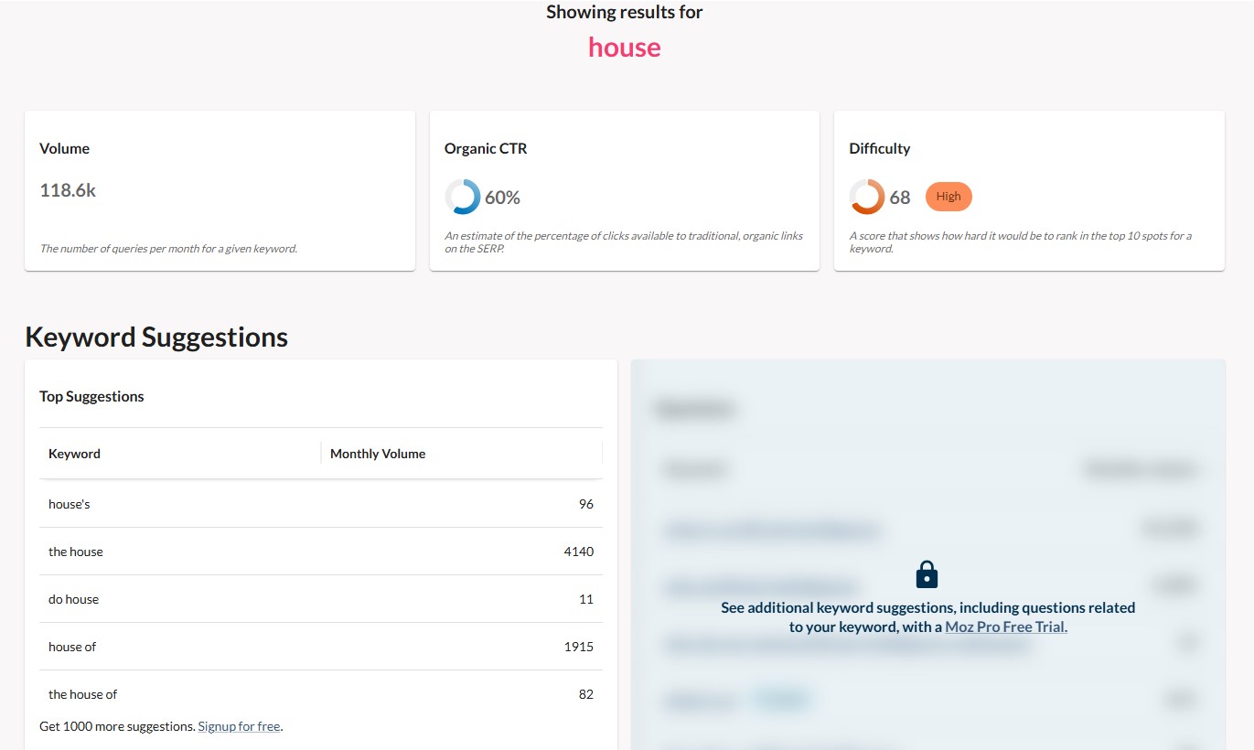 - Overview: The general overview page provides a summary of all the information captured by the Moz Pro tool research. This includes data on search volume, the chance of ranking with the respective keyword, and the overall difficulty of the search term. Additionally, the page lists the top five entries of new keyword suggestions and the top three positions of Google search results. It concludes with three topic-specific reports compiled by the Fresh Web Explorer.
