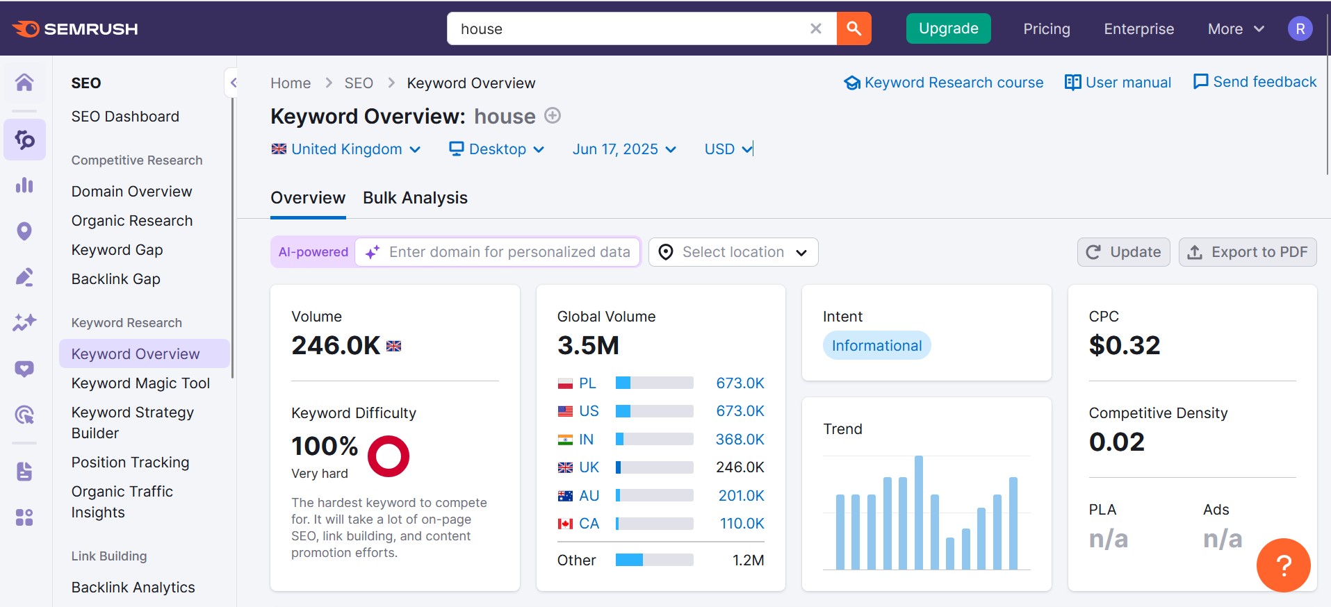 - PPC: Competition level of the term in PPC marketing (Pay-per-Click), expressed on a scale from 0 (not competitive) to 100 (highly competitive)