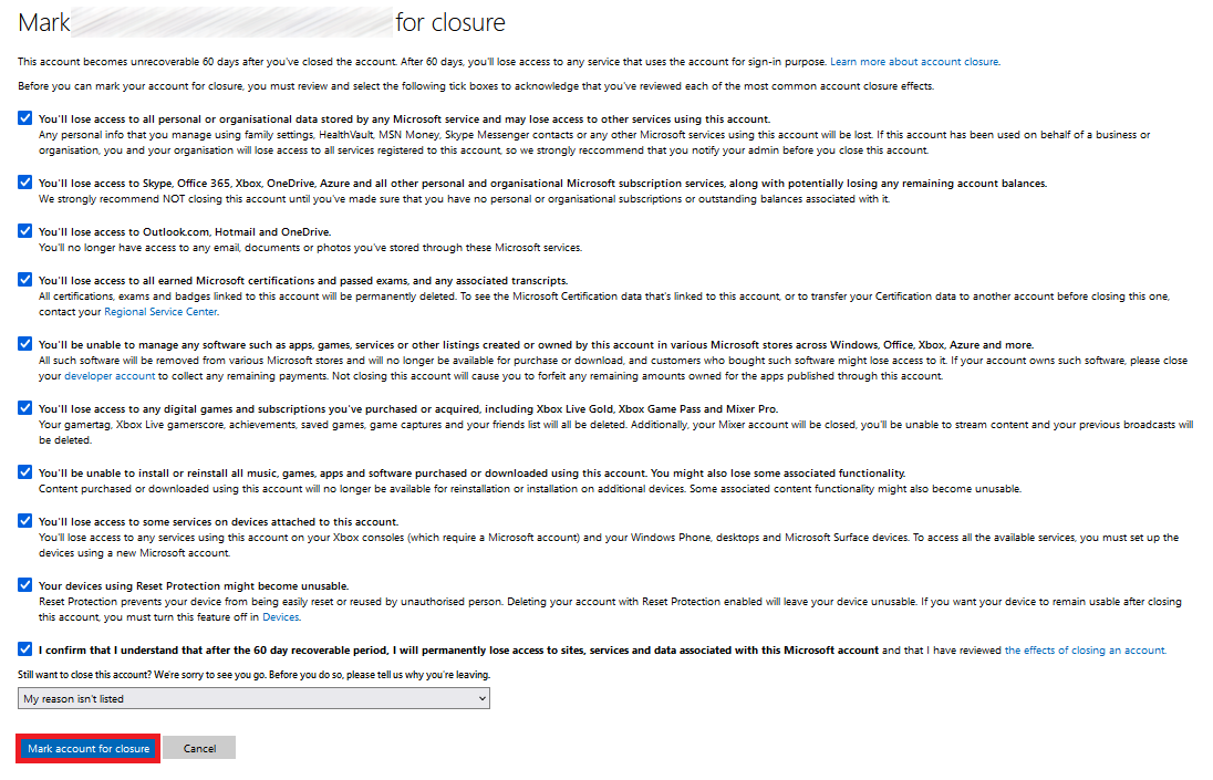 Step 4: Confirm that all content should be deleted by ticking all the boxes and providing a reason for the deletion. Then, click the button labelled ‘Mark account for closure’.