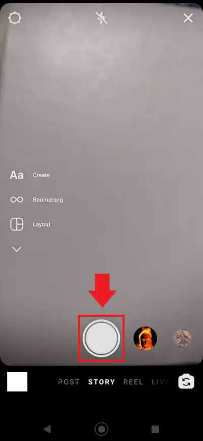 Step 3: If you want to add effects or filters to your video, you can access them by swiping right and left in the menu next to the shutter button. Previews of the various filters will be shown on the screen. You can find additional features on the left side of the screen, including boomerang, text ('Aa'), layout, multi-capture, level, and hands-free.