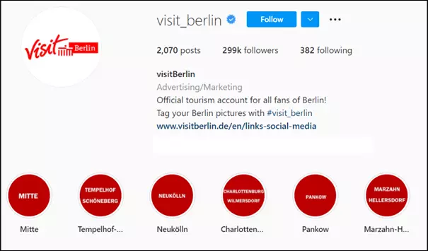 The Instagram bio of tourism portal Visit Berlin features a short description and invites people to share Visit Berlin hashtags. Story highlights are used effectively here.