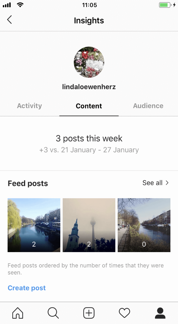 You can see whether your business account is set up (read about how to do this in our article on Instagram for business by checking to see if there is a bar chart symbol on your own Instagram account. Clicking on this symbol will bring you directly to the Instagram analysis section for business clients. At first you will see the account statistics from the last seven days. Along with impressions, reach, and profile views, you can also view the most popular posts and get more information on followers. Bear in mind that Instagram assesses the most popular posts based on impressions and not interactions.