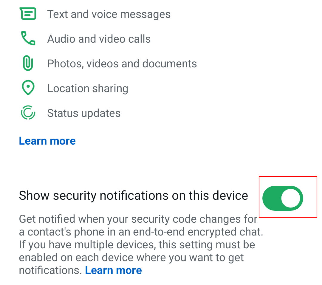 Every WhatsApp chat has end-to-end encryption and a specific security code. The latter may change if, for example, you or your contact has used a new mobile device or reinstalled WhatsApp. Activate security notifications to be notified of these changes.