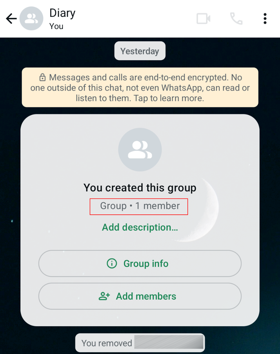 To get started, create a new WhatsApp group. Now add a contact, who ideally knows about your chat plans. Next, remove the contact and rename the group to ‘Diary’. Your private chat is now ready.
