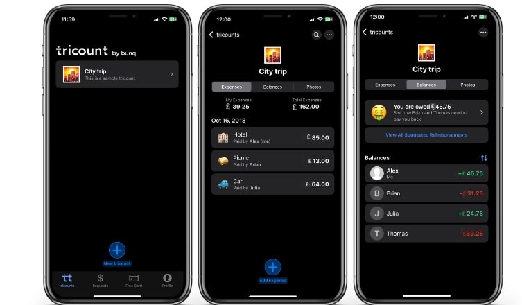 | Tricount | Android, iOS, Web | Unlimited expenses, no registration, PayPal integration, online backups, currency converter, calculator, photo uploads, offline mode, monthly insights, Splitwise import | ✗ (no premium version available) |