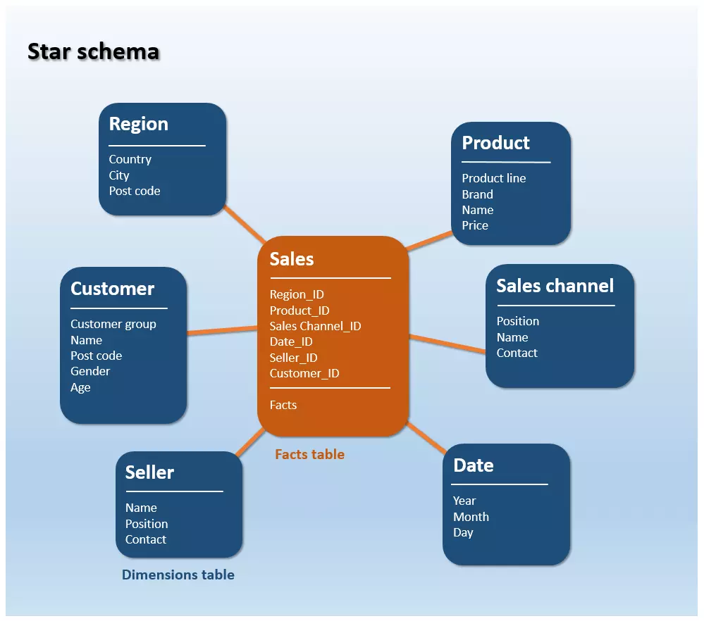 Each star schema is made up of a table of facts as well as multiple dimension tables that then group themselves in a star shape around the table of facts.