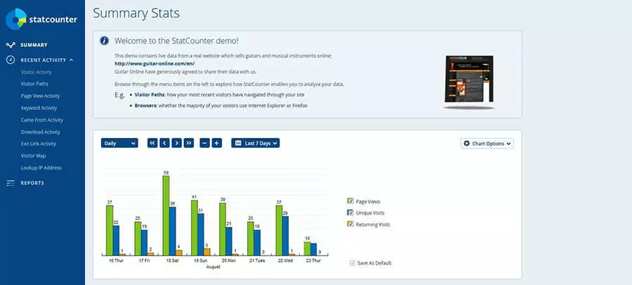The penultimate option when it comes to alternatives to Google Analytics, is StatCounter StatCounter. With StatCounter you get simple analysis software with similar functions to the “original”. The tool is free up to a certain number of page views (500 per month). Google AdWords campaigns can be integrated, which is very practical. StatCounter is basically a good entry-level solution for small sites that don’t want to make a big investment, but are looking for a solid alternative to Google Analytics. The dashboard, however, is quite unclear and the whole layout isn’t very attractive.