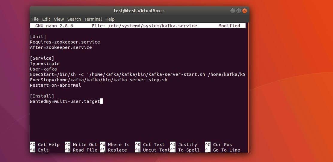 sudo nano /etc/systemd/system/kafka.serviceThen, copy the following content into the new file that has already been opened in the nano text editor: