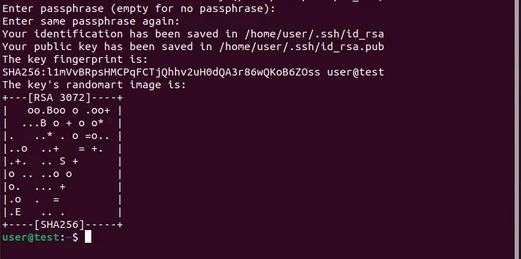 In both instances, use the enter key to confirm your choice. You will receive confirmation of the key being successfully created in the way of a ‘randomart image’ of the SSH key.