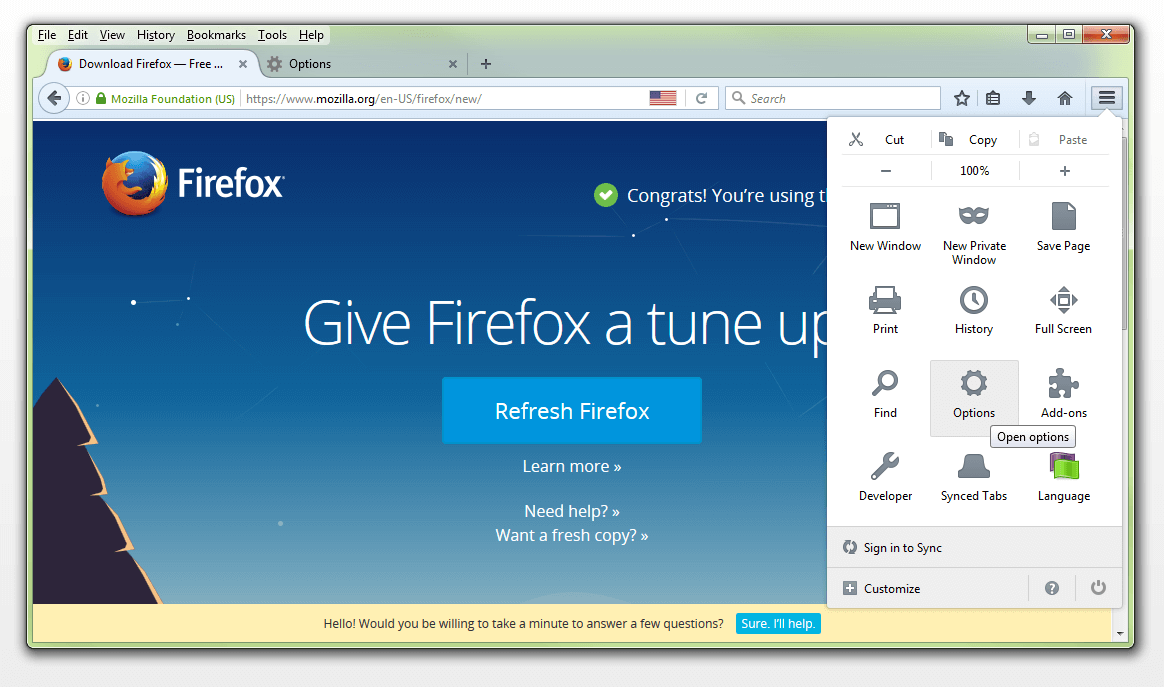 To access the proxy settings in Firefox, click the Firefox menu symbol in the upper right-hand corner and select the ‘Settings’ option.