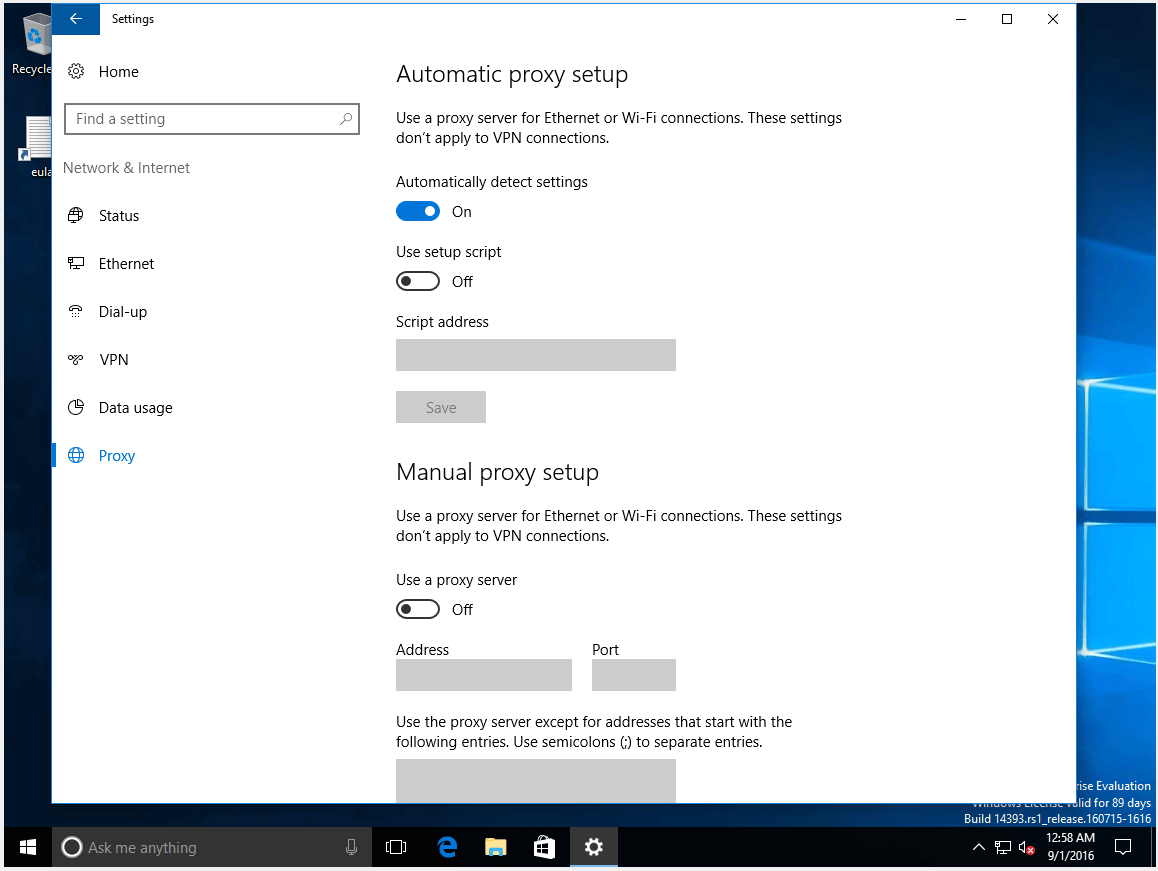 This will present you with three configuration options. Windows can automatically detect the proxy settings, use an automatic configuration script, or use manual settings.