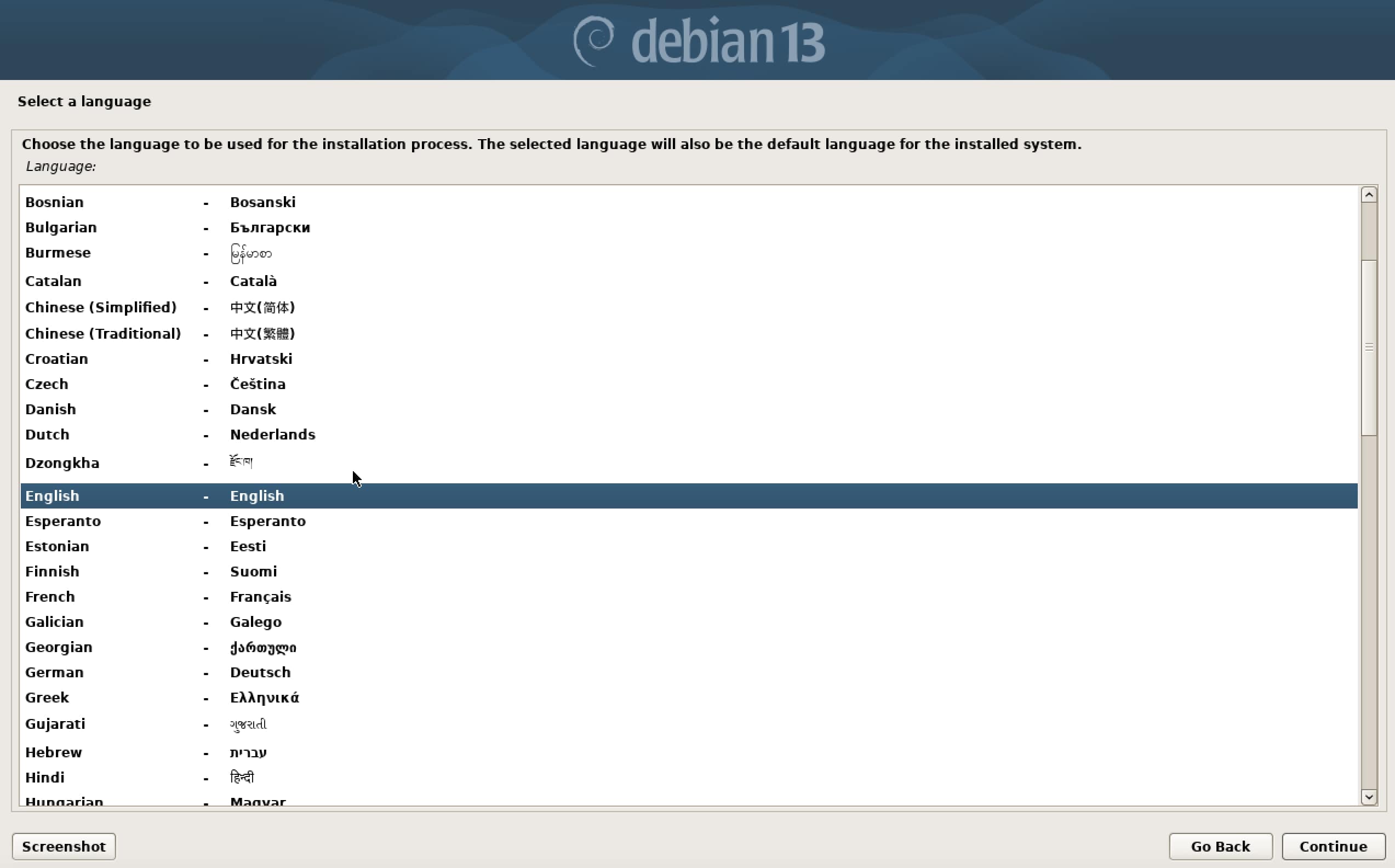 Once the Debian installation menu appears, the first step is to choose the installation language. This language will also be applied to the system’s user interface after installation.