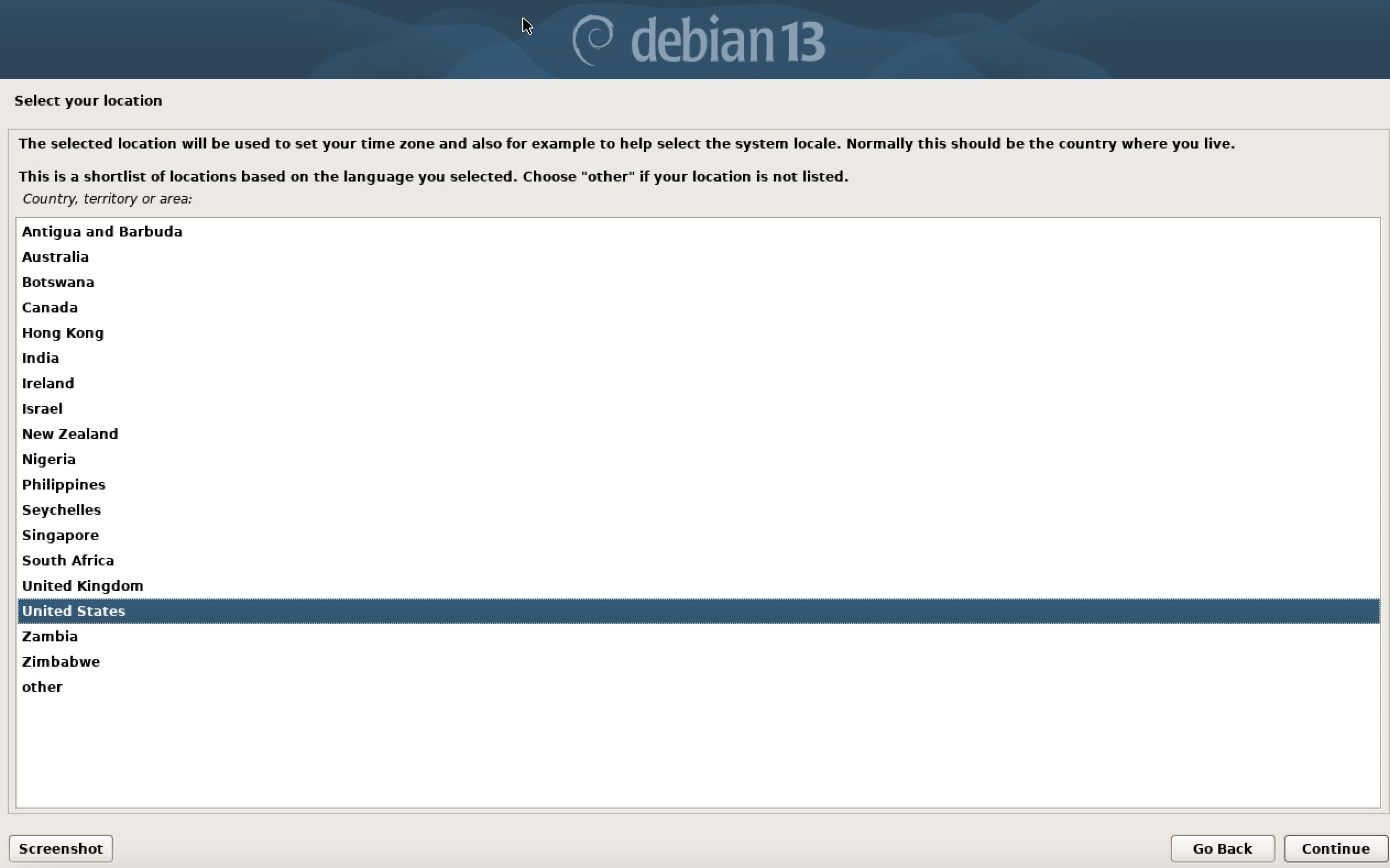 Next, select your country and region. Debian uses this information to set the correct time zone and recommend suitable default settings for your system. After making these selections, you can continue to the next step.