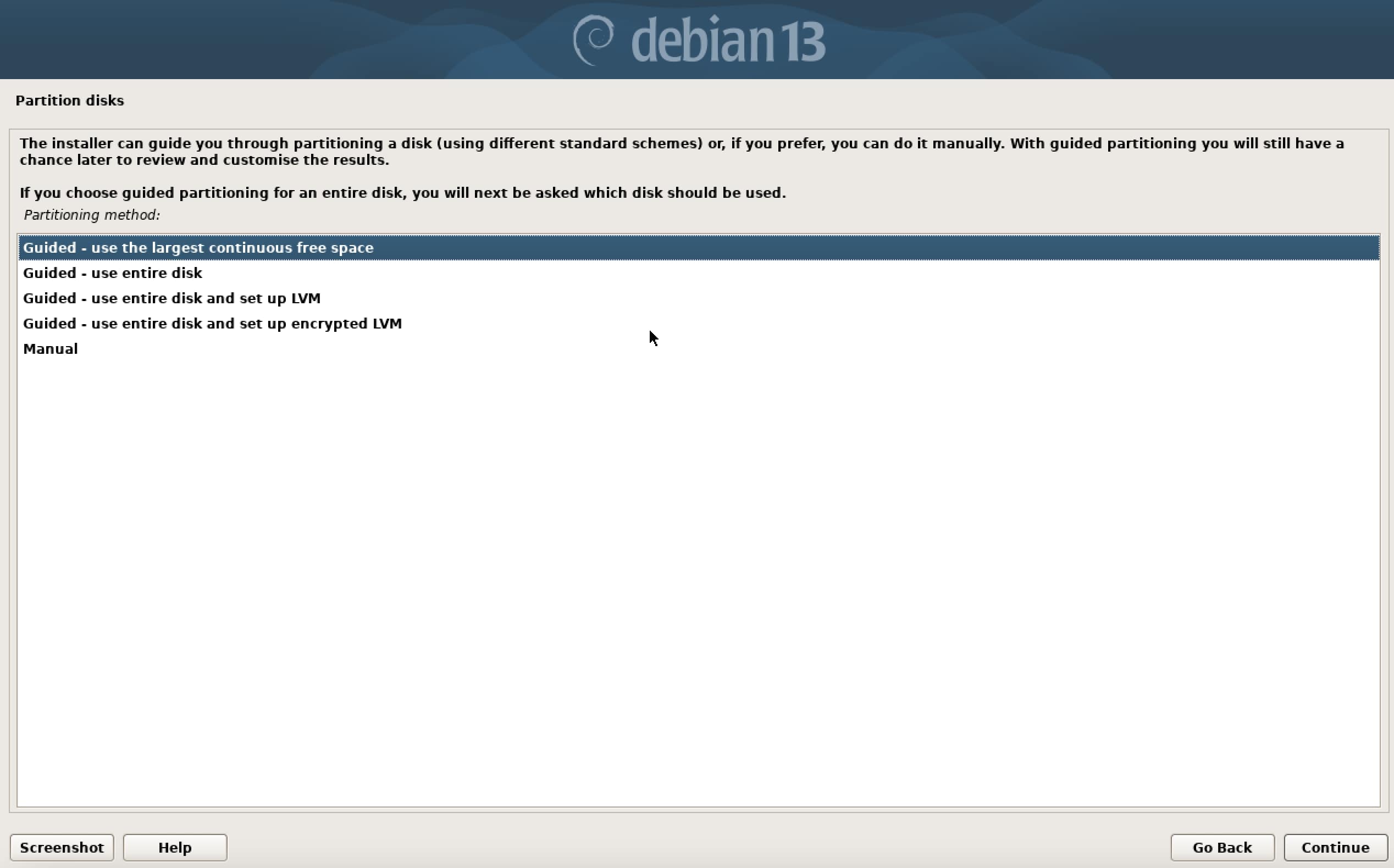 Next, you need to prepare the hard drive for installing Debian 13. Debian provides several options for partitioning the drive. For beginners, the option ‘Guided – use the largest continuous free space’ is recommended, as it automatically creates all required partitions without manual setup.