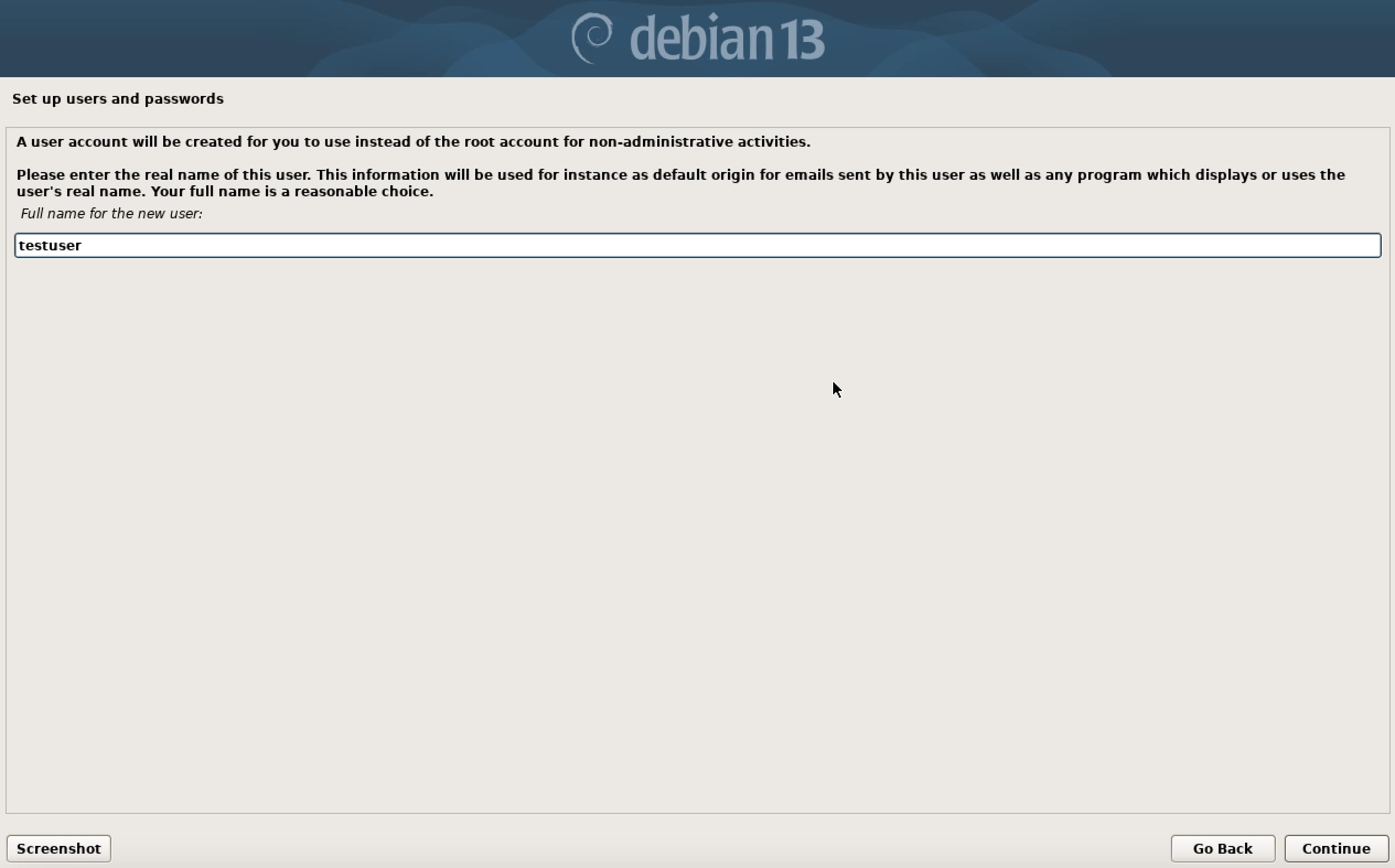 After that, Debian will guide you through creating a regular user for everyday use. Start by entering the full name of the user (for example, your own name). Then, define a username that you will use to log in later.