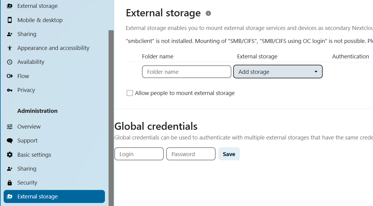 The following step-by-step guide shows you how to add external storage to Nextcloud using the built-in External Storage Support app:
