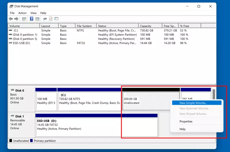 After you have deleted a hard disk partition in Windows 11, the space of this partition will appear in the Disk Management with the label ‘Unallocated’. You can now assign the quota to another existing partition on the same hard drive by right-clicking the partition you would like to extend and clicking ‘Extend Volume’.