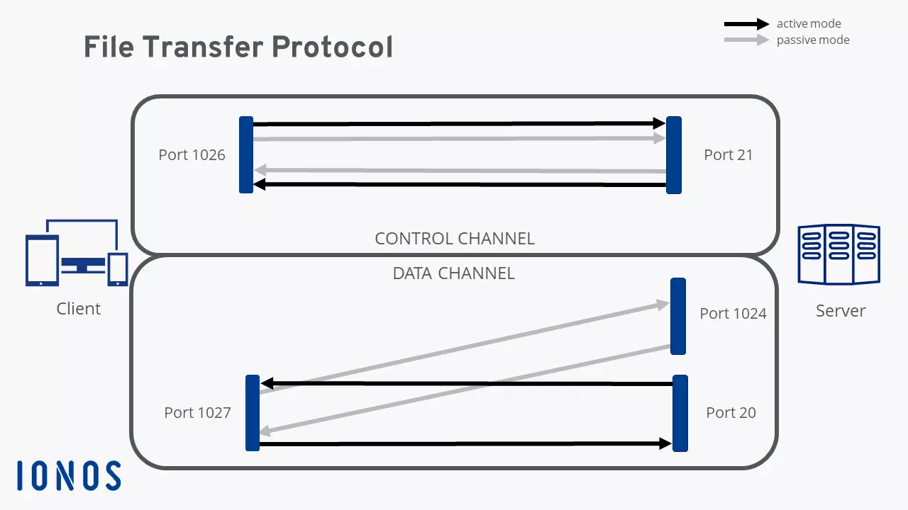 We can make a distinction between active and passive FTP. In the active version, the client establishes the connection using Port 21, as described above, and tells the server which port can be used to deliver its answers. However, if the client is protected by a firewall then the server cannot send any answers, since all external connections are blocked. That’s why passive mode was developed. This way, the server can send a port number to the client that the client can then use to establish a data channel. Since the client initiates the connection themselves, their firewall cannot block the transfer.