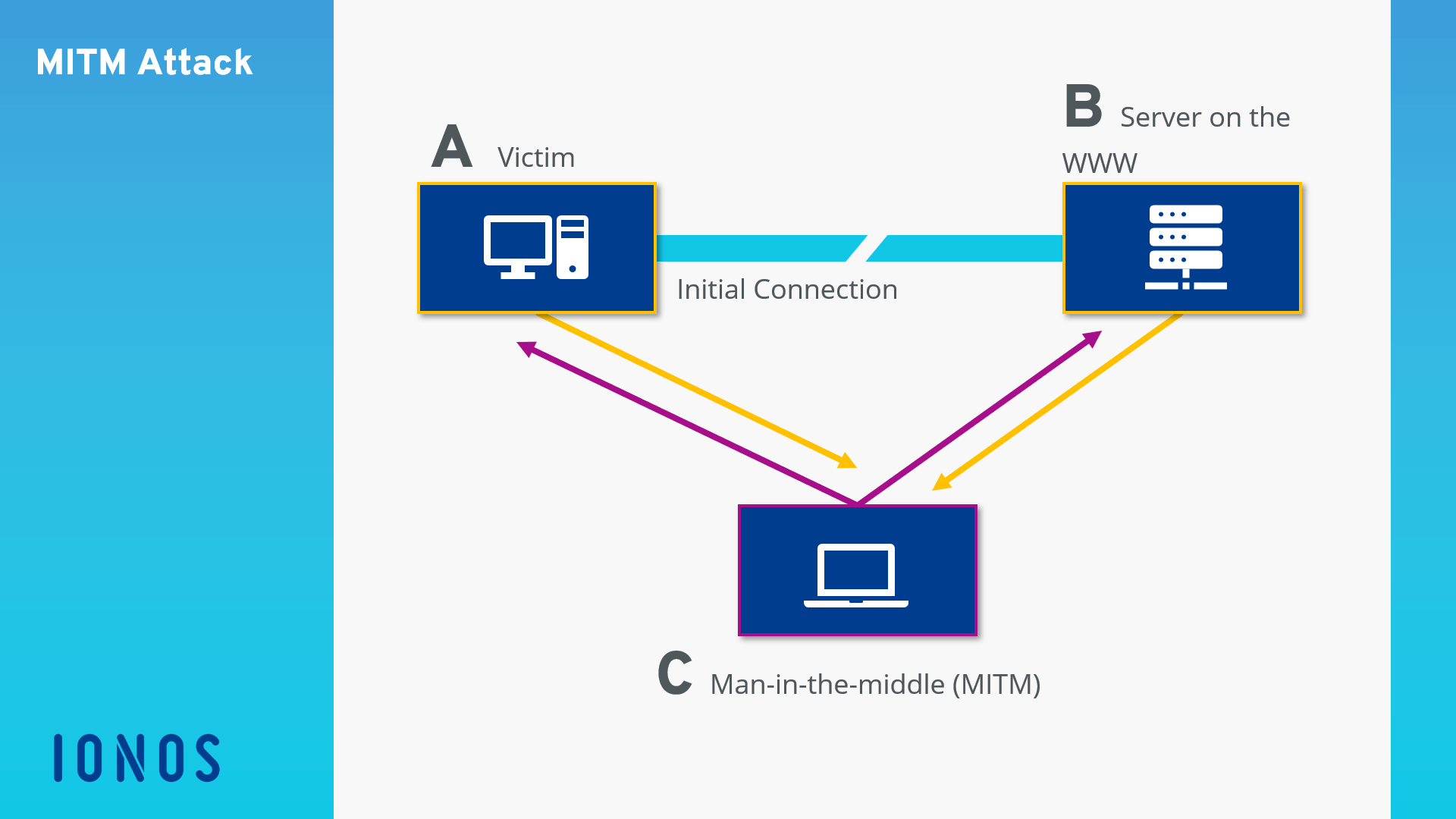 System A attempts to establish an encrypted connection with System B. Instead, the data flow is redirected by a criminal third party, which results in the encrypted connection running from system A to system C and only then is it redirected to System B. This means that the one in control of System C (usually the attacker) can see the data traffic in its entirety, record it, or manipulate it – often with the communication partners being unaware of anything fishy having taken place. In the World Wide Web context, System C would present itself to System A as a web server, and as a web browser to System B.The following graphic illustrates the based scheme of a Man-in-the-Middle attack.
