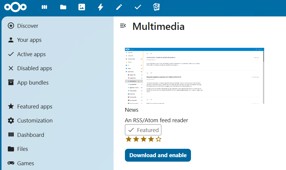 - Install Nextcloud News: Click on Download and Enable to install the app.