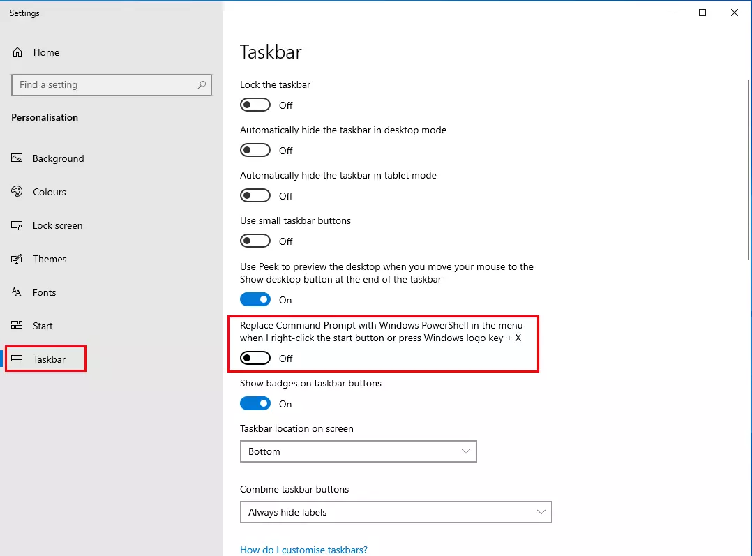 You can replace the Windows PowerShell menu items with Command Prompt. To do this, go to Personalisation-> Taskbar in the Windows Settings app and disable the following option: “Replace Command Prompt with Windows PowerShell in the menu when I right-click the start button or press Windows logo key + X.”