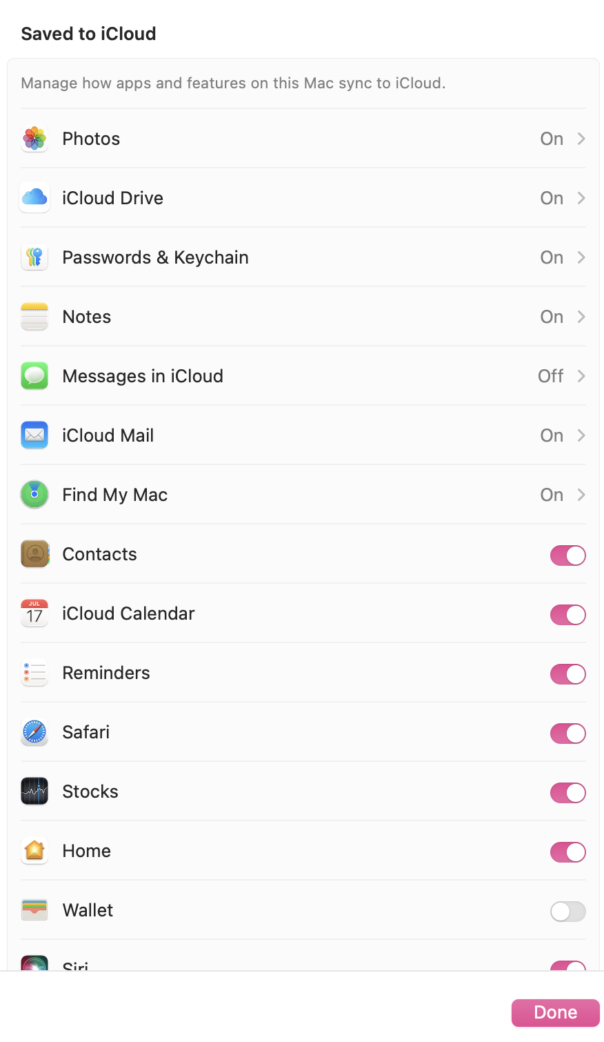 You’ll now see a menu called ‘Saved to iCloud’. Click on ‘See All’ to view a list of all the available iCloud services. You can activate or deactivate each service individually by clicking the toggle. The changes will then be saved to all the Apple devices you are logged into with your Apple Account.
