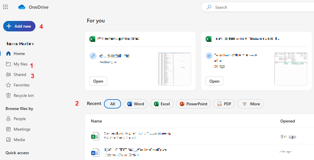 The user interface in OneDrive is basically self-explanatory and easy to use. The left side menu shows you the most important items, including your content stored in the cloud under ‘My files’ (1). Documents and media files that you have used recently can be found under ‘Recently used’ (2). Files that you edit or share with others are in the ‘Shared’ folder (3). The ‘New’ option (4) is used to create new folders or documents or to store new folders or files in the cloud.